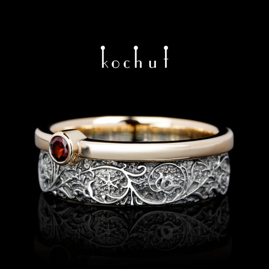 Harmonie der Natur — Ring aus Silber, Rotgold mit Granat, überzogen mit schwarzem Rhodium