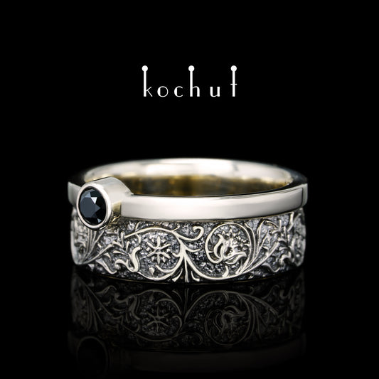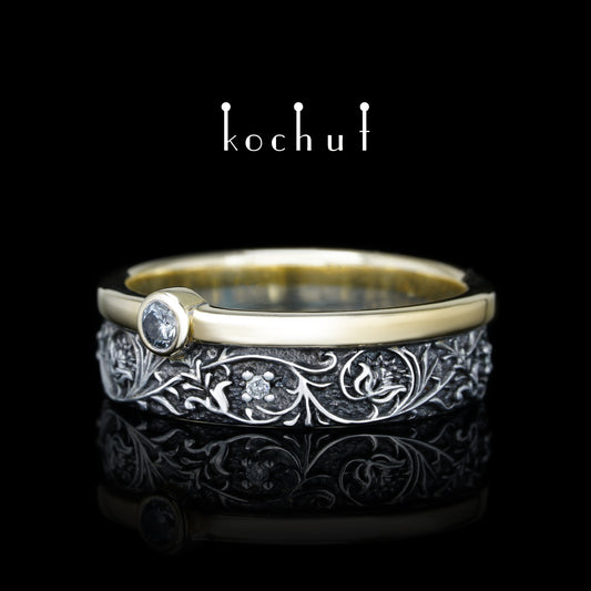 Harmonie der Natur — ein Ring aus Silber und Gelbgold mit Diamanten, überzogen mit schwarzem Rhodium