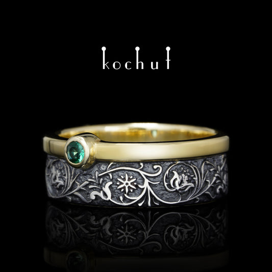 Harmonie der Natur — Ring aus Gelbgold und Silber mit Smaragd, überzogen mit schwarzem Rhodium