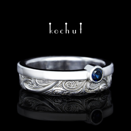 In Freude und Leid: Hälften — Silberhochzeitssilberring mit Saphir, überzogen mit weißem Rhodium