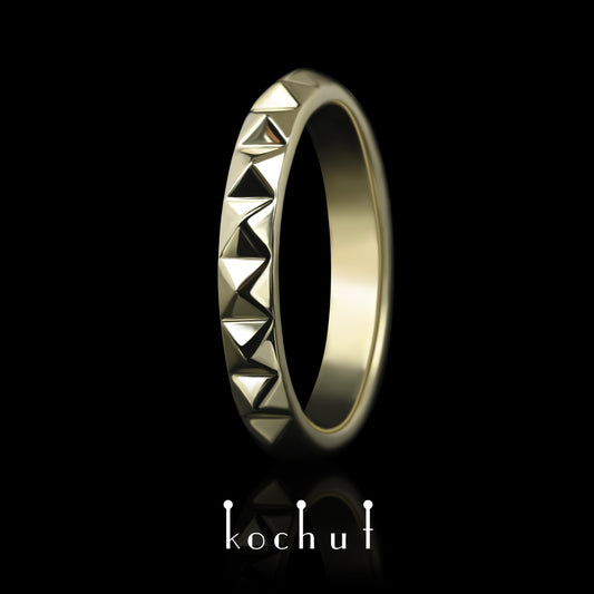Leuchten der östlichen Sterne — Mokume-Ring aus Gelb-, Rotgold und graviertem, oxidiertem Silber mit Rändern aus Weißgold