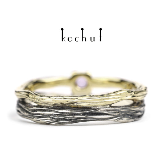 Auge des Waldes — Ehering aus oxidiertem Silber und Gelbgold mit Amethyst