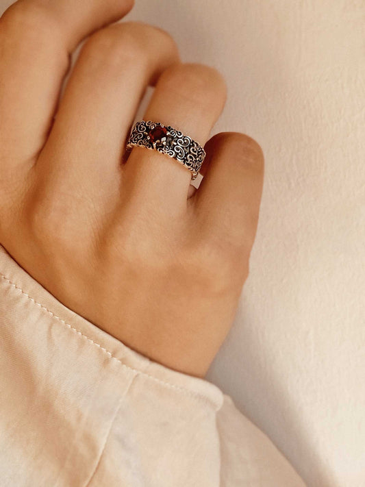 Notre-Dame — Ring aus oxidiertem Silber mit Granat