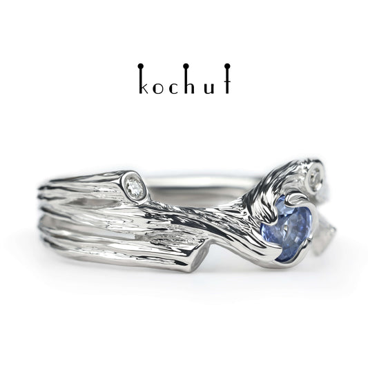 Zweig — Weißgoldring mit Kornblumen-Saphir und Diamanten, platiert mit WeißgoldrhODium
