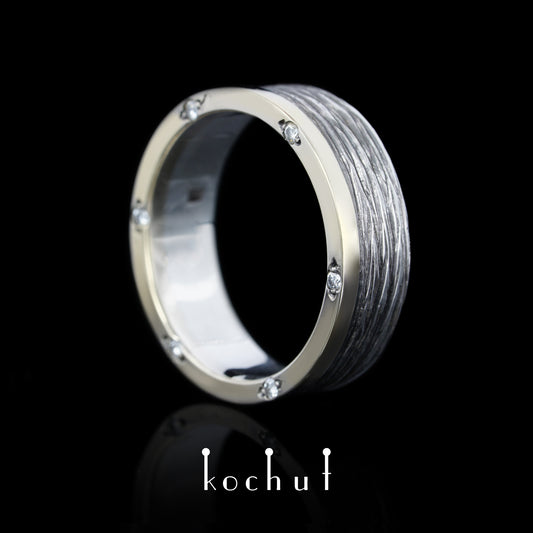 Baumrinde mit Rand — Ehering aus oxidiertem Silber und Weißgold