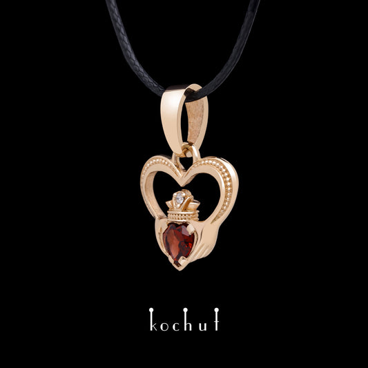 Claddagh — Anhänger aus Rotgold, mit rotem Granat und Diamant