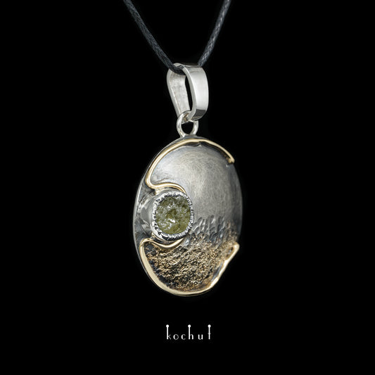 Kosmischer Anbruch — Anhänger aus oxidiertem Silber und Gelbgold mit grünem Granat-Kristall