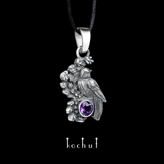 Vogel auf einem Lavendelzweig — Anhänger aus oxidiertem Silber mit Amethyst