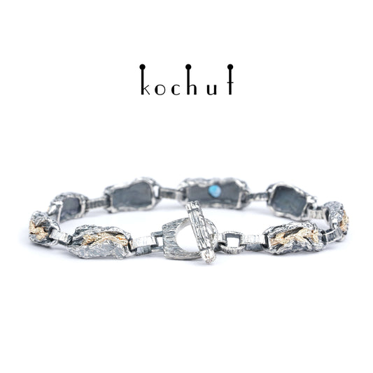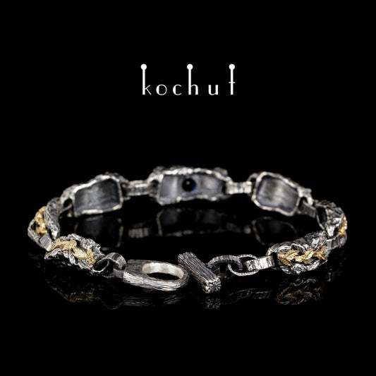 Kraft des Lebens — Armband aus oxidiertem Silber und Gelbgold mit Saphir