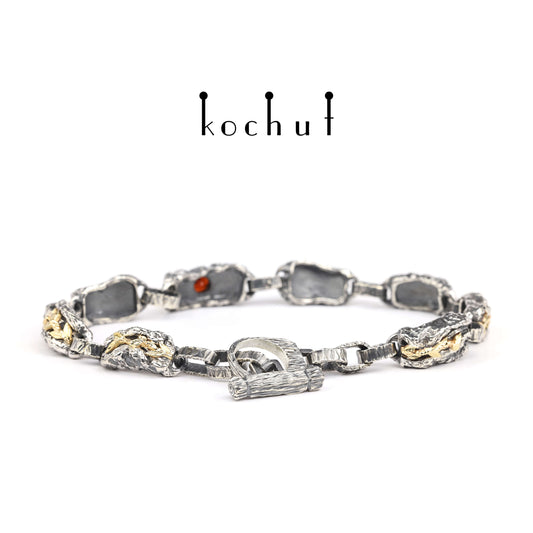 Kraft des Lebens — Armband aus oxidiertem Silber und Gelbgold mit Granat