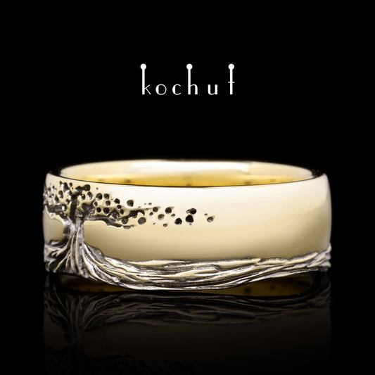 Baum des Lebens — Ehering aus Gelbgold mit schwarzem Rhodium beschichtet