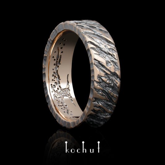 Baum des Lebens: Aschenrinde — Ehering aus Rotgold, beschichtet mit schwarzem Rhodium
