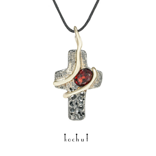 Guardian — Kreuz aus oxidiertem Silber und Gelbgold mit Granat