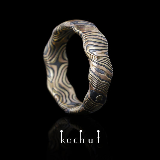 Waves — Mokume-Ring aus Rotgold, Gelbgold sowie graviertem und oxidiertem Silber