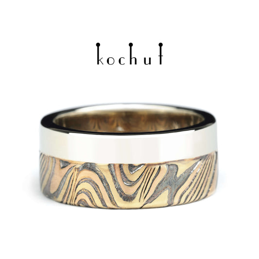 Tenno — Mokume-Ring aus Rotgold, Gelbgold, graviertem und oxidiertem Silber