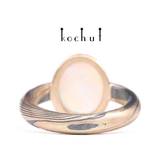 Haiku — Mokume-Ring aus Rotgold, graviertem und oxidiertem Silber mit Opal