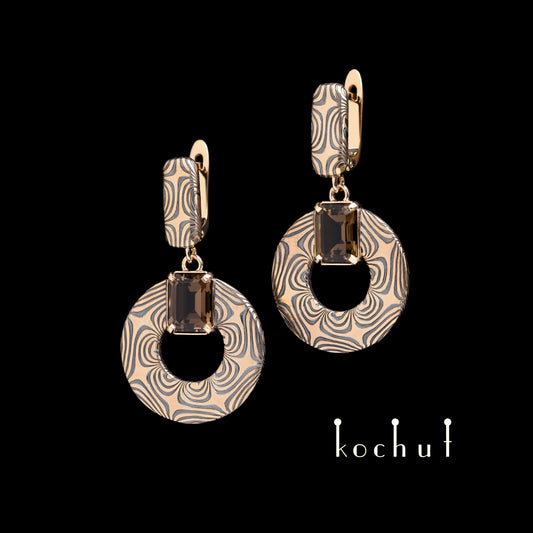 Wertvoller Astrolabium — Mokume-Ohrringe aus Rotgold, graviertem und oxidiertem Silber mit Rauchquarz