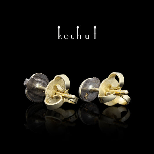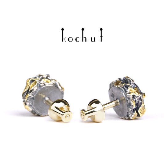 Sonniger Wald — Ohrringe aus oxidiertem Silber und Gelbgold mit Granaten und Vergoldung
