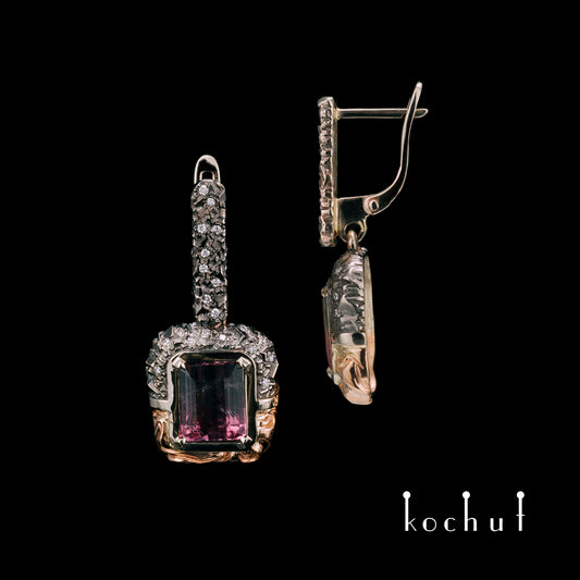 Geheimnisse des Universums — Ohrringe aus Weiß- und Rotgold mit polychromem Turmalin und Diamanten, überzogen mit schwarzem Rhodium