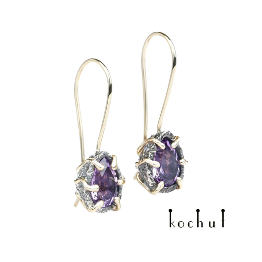 Aurora — Ohrringe aus oxidiertem Silber und Gelbgold mit Amethysten