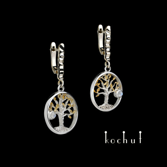 Baum des Lebens — Ohrringe aus Weißgold und Silber mit Mondsteinen und Vergoldung