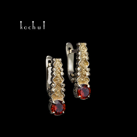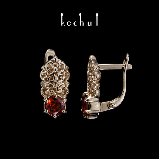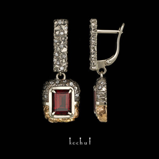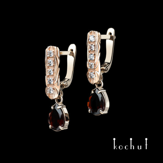 Geheimnisse des Universums — goldene Ohrringe mit Granaten und Diamanten