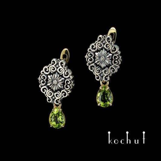 Notre-Dame — Ohrringe aus oxidiertem Silber und Gelbgold mit Chrysolith