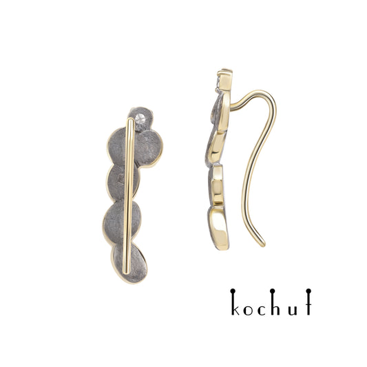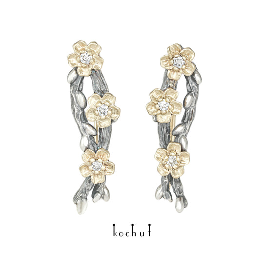 Weidenzweige mit Blumen — Ohrringe aus oxidiertem Silber und Gelbgold mit Diamanten