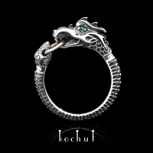 Dragon — Ring aus oxidiertem Silber und Gelbgold mit Smaragd