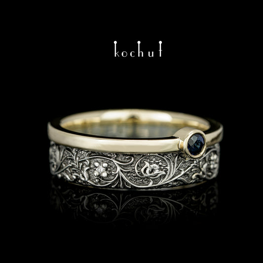 Harmonie der Natur — ein Ring aus Silber und Gelbgold, mit Saphir und Diamanten, beschichtet mit schwarzem Rhodium