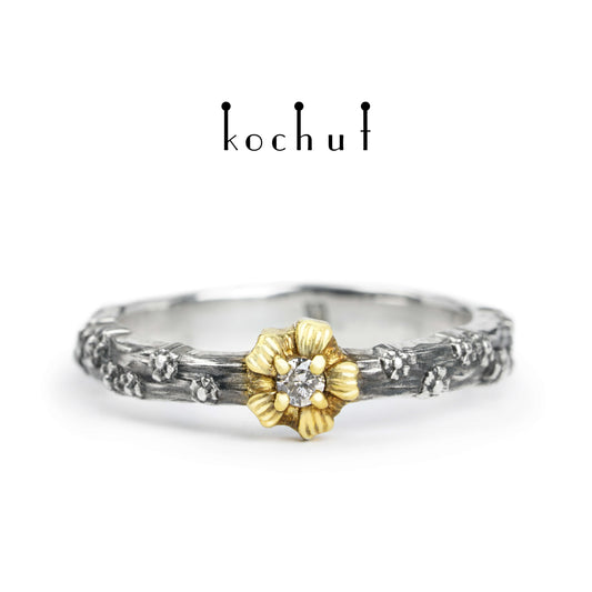 Vergissmeinnicht — Ring aus oxidiertem Silber mit Diamant und Vergoldung