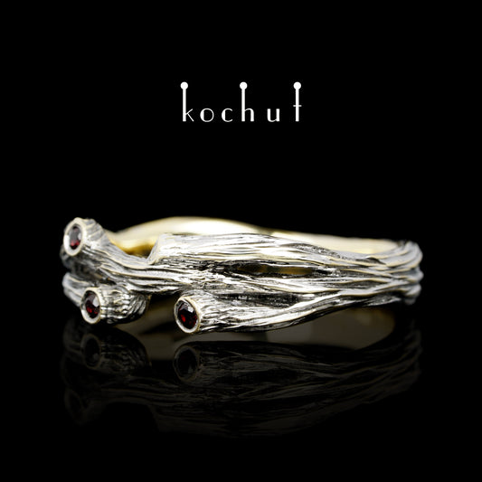 Zweig: Revival — Ring aus Gelbgold mit roten Granaten, beschichtet mit schwarzem Rhodium