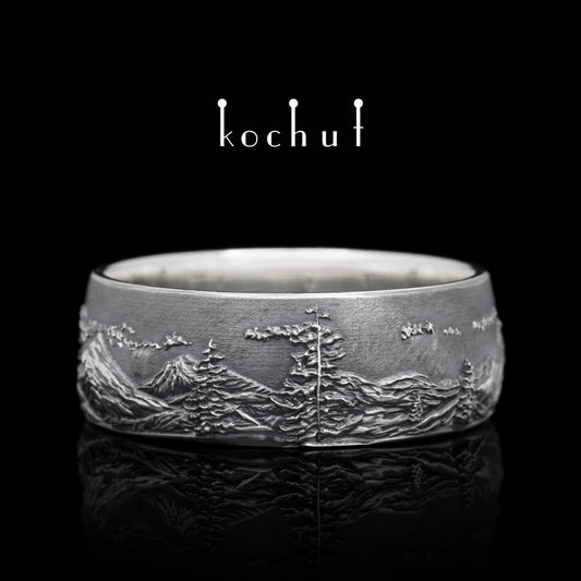 Berge mit Tannenbäumen — Ehering aus oxidiertem Silber