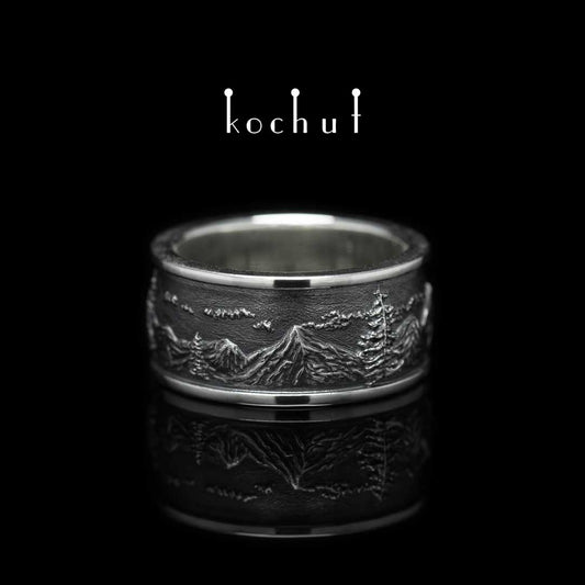 Berge mit Tannen mit Rändern — Ring aus oxidiertem Silber