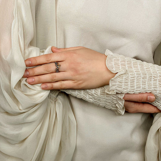 Blumenkrone — Ring aus oxidiertem Silber mit Vergoldung und Saphiren