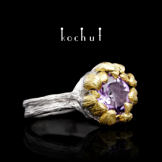 Pfingstrose — silberner Ring mit Amethyst, beschichtet mit weißem Rhodium und Vergoldung