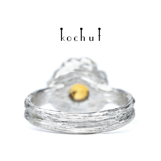 Pfingstrose — silberner Ring mit Citrin, überzogen mit WeißrhODIUM und veredelt mit Gold.