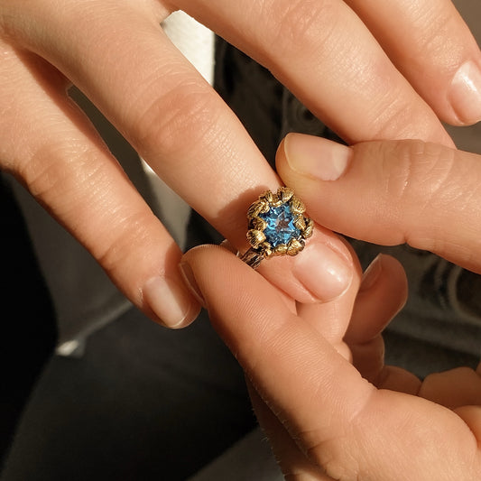 Pfingstrose — Ring aus oxidiertem Silber mit Topas und Vergoldung