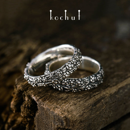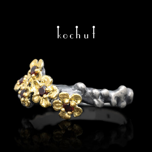 Florale Tiara — Ring aus oxidiertem Silber mit Granaten und Vergoldung