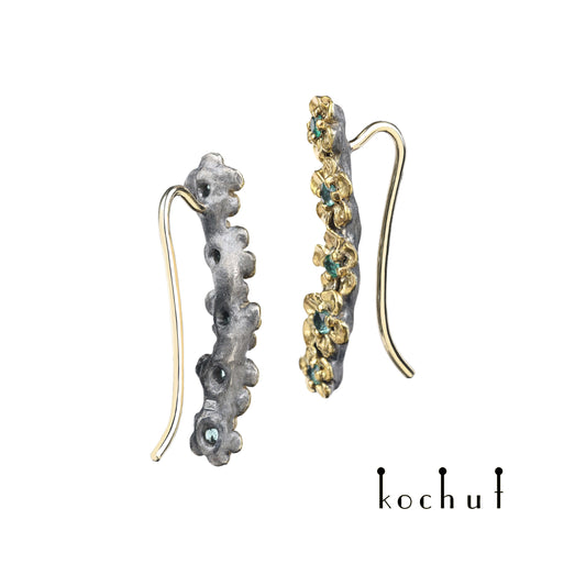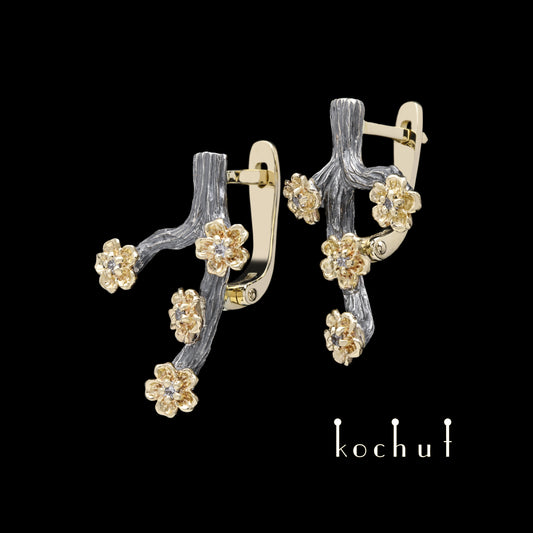 Zweige und Blumen — Ohrringe aus oxidiertem Silber und Gelbgold mit Diamanten