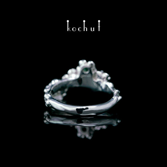 Florale Tiara — silberner Ring mit Smaragden, überzogen mit weißem Rhodium