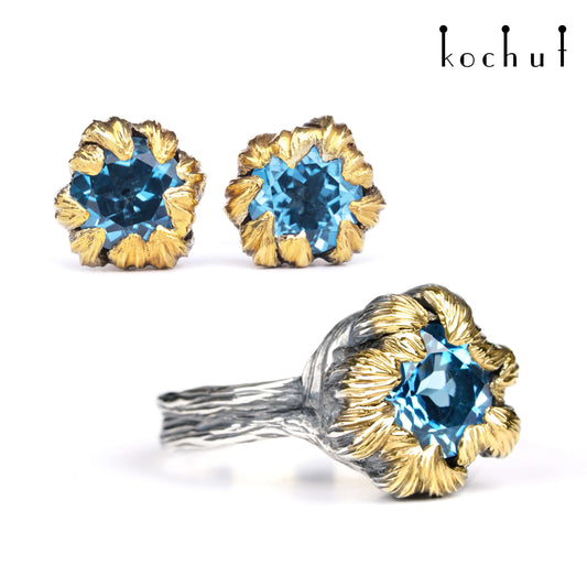 Pfingstrosen — Set aus oxidiertem Silber mit Topasen und Vergoldung