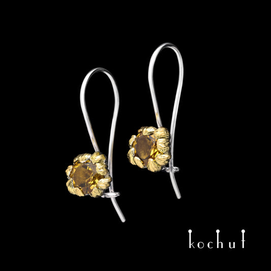 Pfingstrosen — silberne Ohrringe mit Citrinen, überzogen mit weißem Rhodium und Gold.