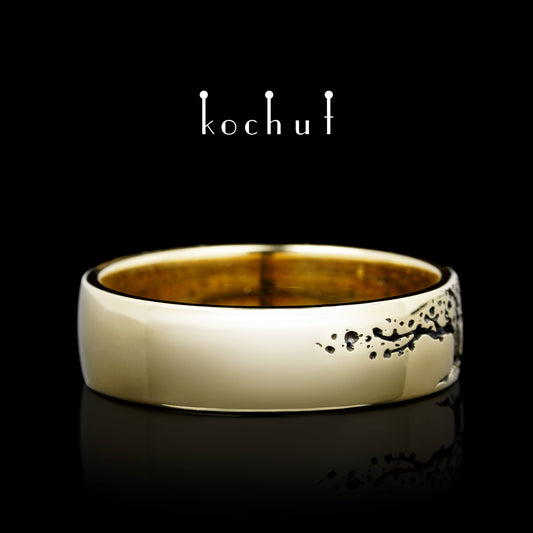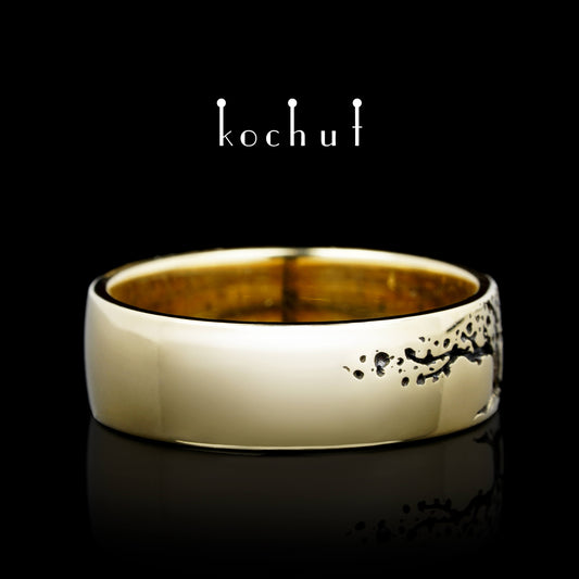 Baum des Lebens — Ehering aus Gelbgold mit schwarzem Rhodium beschichtet