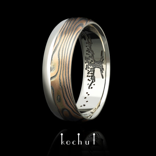 Bonsai — Mokume-Ehering aus Rotgold, Weißgold sowie graviertem und oxidiertem Silber, plattiert mit schwarzem Rhodium