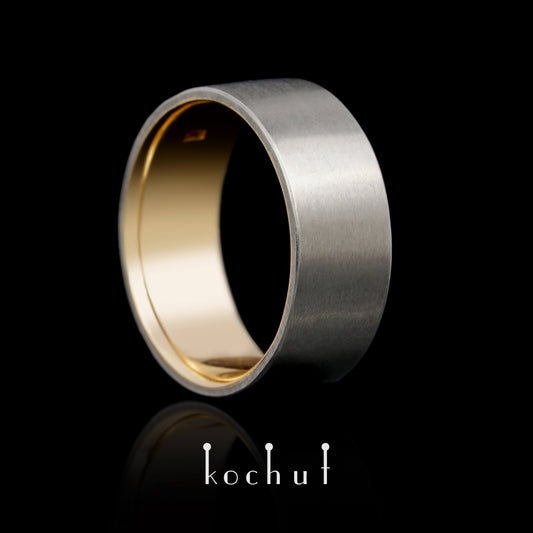 Die letzte Grenze – flach geformter Ehering aus Gelbgold und Sterlingsilber