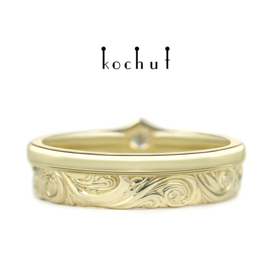 Freude und Traurigkeit: Hälften — Ehering aus Gelbgold mit Diamant