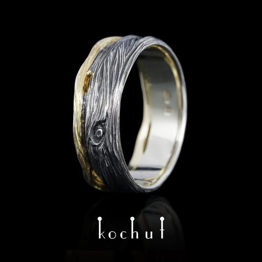 Auge des Waldes — Ehering aus Gelbgold und oxidiertem Silber