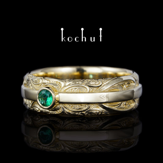 In Freude und Leid: gemeinsame Gedanken — Ehering aus Gelbgold mit Smaragd