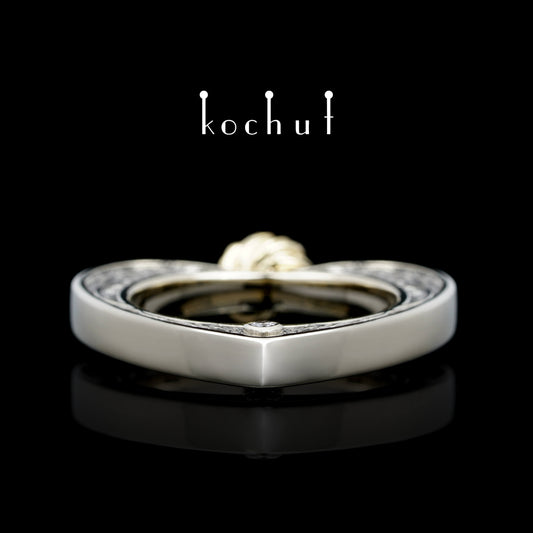Triumph des Lebens — Verlobungsring aus 18 Karat Weißgold und 14 Karat Gelbgold mit Diamanten und Saphiren, überzogen mit schwarzem Rhodium